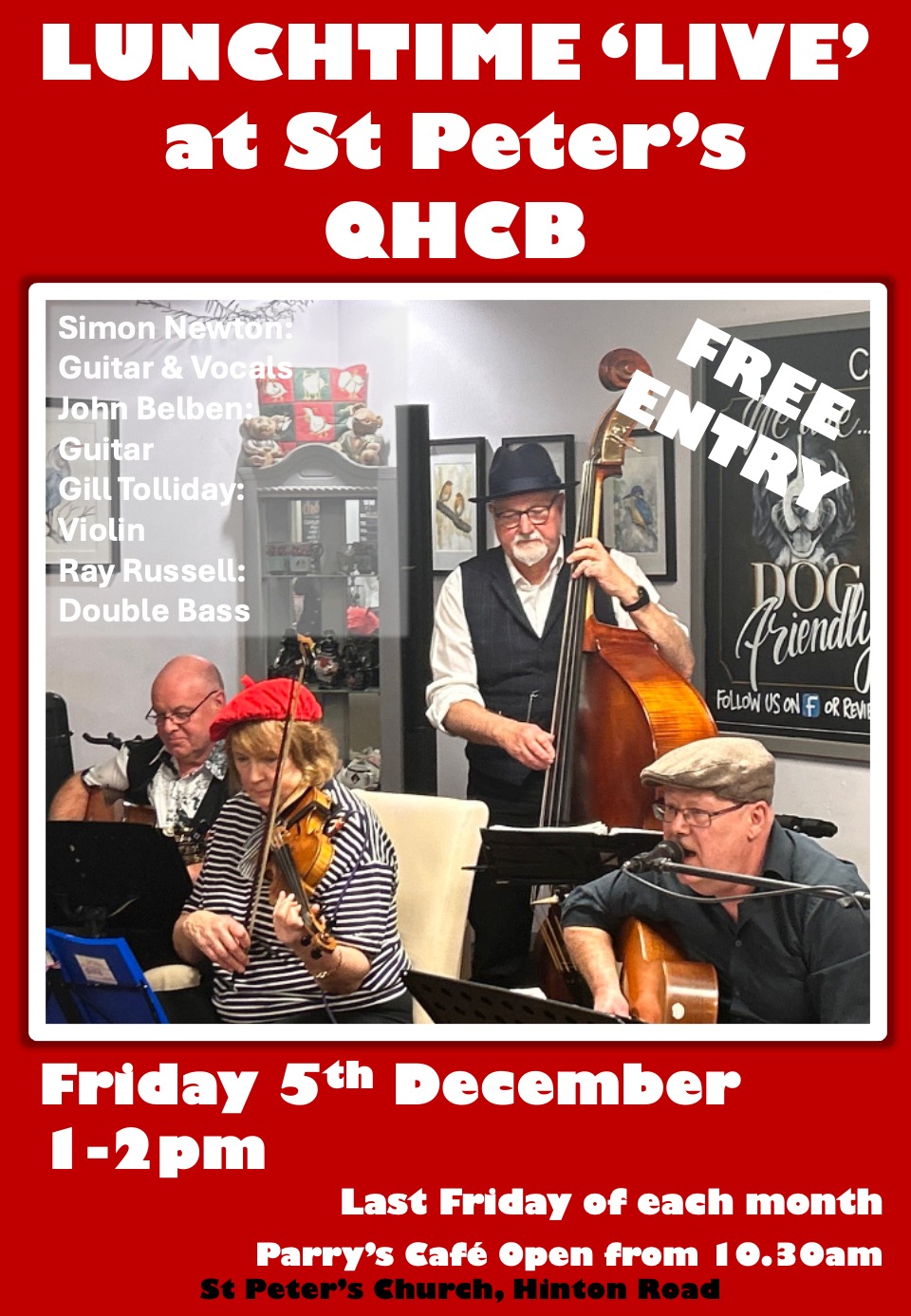 Friday Lunchtime Live at St Peter’s – QHCB performing! Friday 5th December 2025 1:00 pm – 2:00 pm St Peter's Church Hinton Road, BH1 2EE Get Directions Parry’s Cafe open from 10.30am, serving a wide range of hot and cold drinks, snacks and tasty treats and light lunches.Admission is FREE so come and have some fun on a Friday down at St Peter’s!