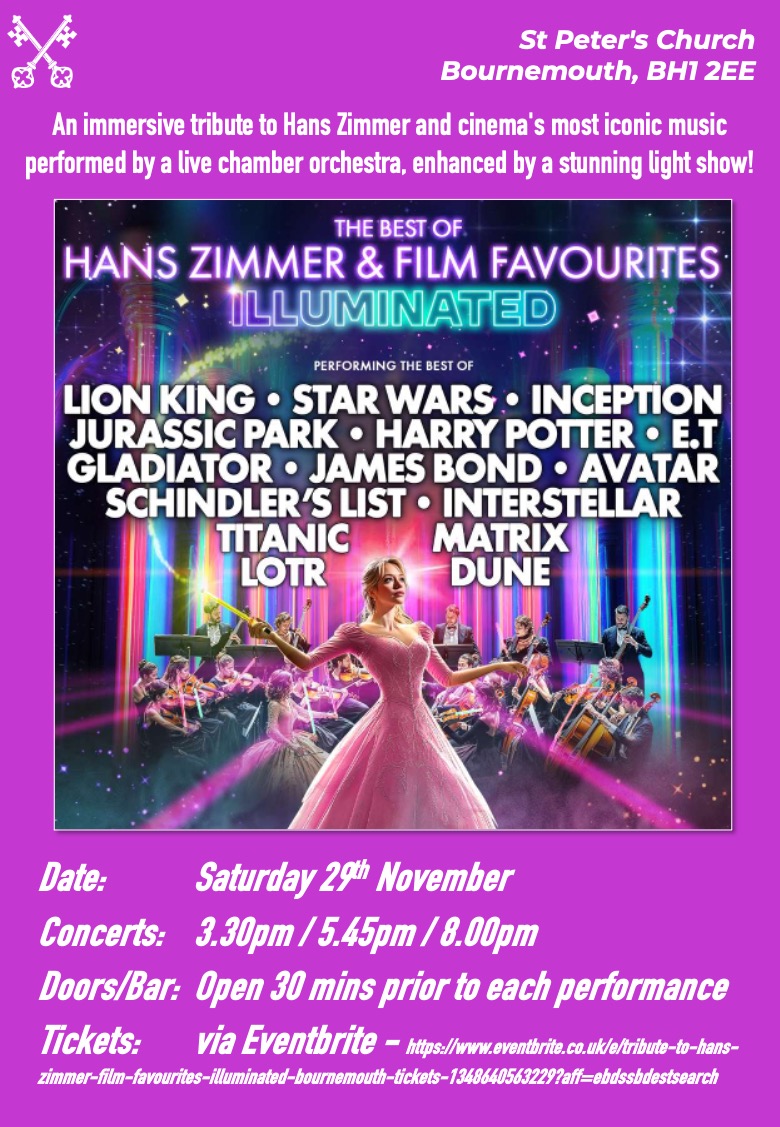 Illuminated Orchestra – The Best of Hans Zimmer and Film Favourites Saturday 29th November 2025 3:30 pm – 4:30 pm St Peter's Church https://www.facebook.com/IlluminatedOrchestra/videos/1043834587113921 Concerts: 3.30pm / 5.45pm / 8.30pm Doors/Bar: 30 minutes prior to each performance Tickets: via Eventbrite https://www.eventbrite.co.uk/e/tribute-to-hans-zimmer-film-favourites-illuminated-bournemouth-tickets-1348640563229