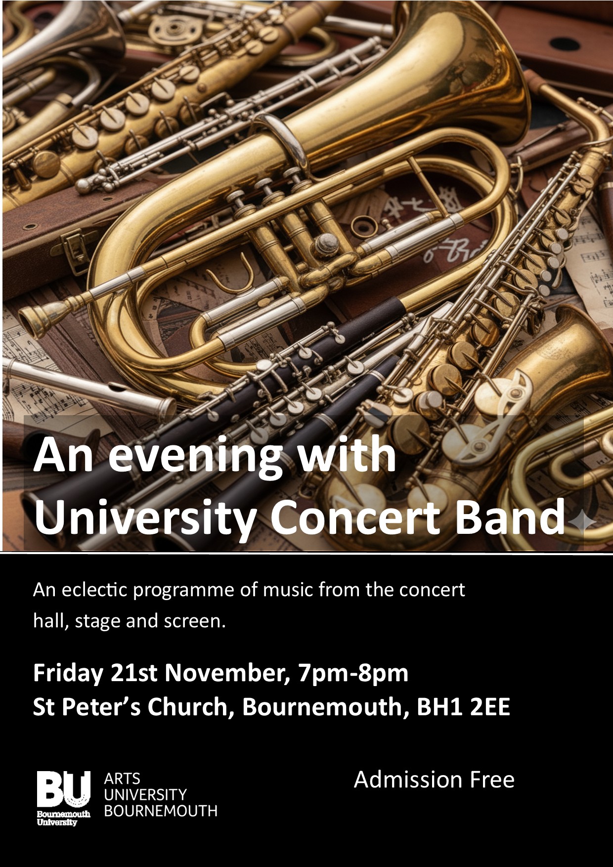 University Music Concert Band Concert Friday 21st November 2025 7:00 pm – 8:00 pm St Peter's Church Hinton Road, BH1 2EE Get Directions Doors/Bar: 6.15pm Performance: 7pm – 8pm Admission: Free