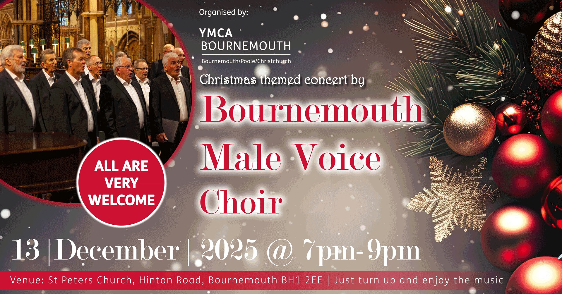 YMCA Christmas Carol Concert with the Bournemouth Male Voice Choir Saturday 13th December 2025 7:00 pm – 9:00 pm St Peter's Church Hinton Road, BH1 2EE Get Directions Doors/Cafe Open from 6.30pmFree entry with a retiring collection in aid of the YMCAAll welcome to come along and enjoy a Christmas-filled evening, all for a great cause!