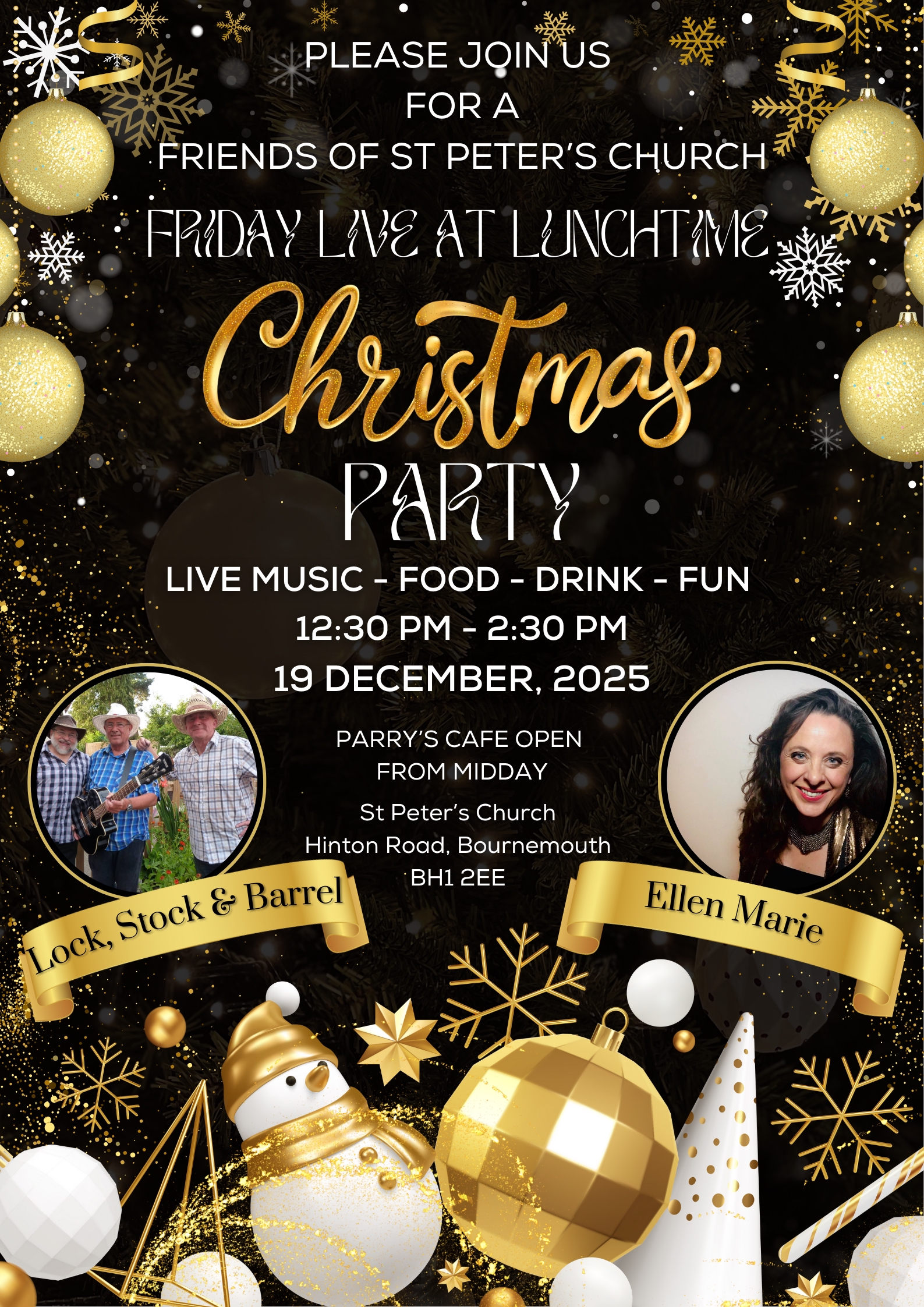 Friday Live at Lunchtime today is a festive treat in store for all from 12.30pm. Come on down to St Peter’s and enjoy mulled wine and mince pies on us, plus all the other usual Parry’s Cafe fare, while Lock, Stock & Barrel plus Emaire keep you all entertained.